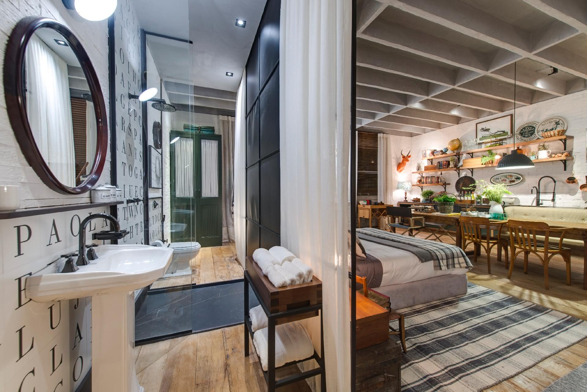 Para otimizar o espaço o melhor item a utilizar são as portas de correr, que não necessitam de ângulo de abertura. Você pode colocar para o box ou como a porta de entrada.